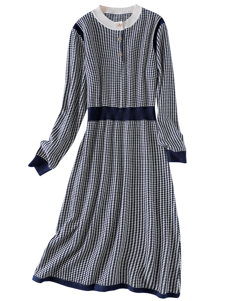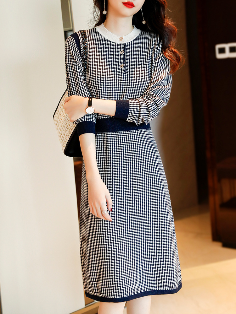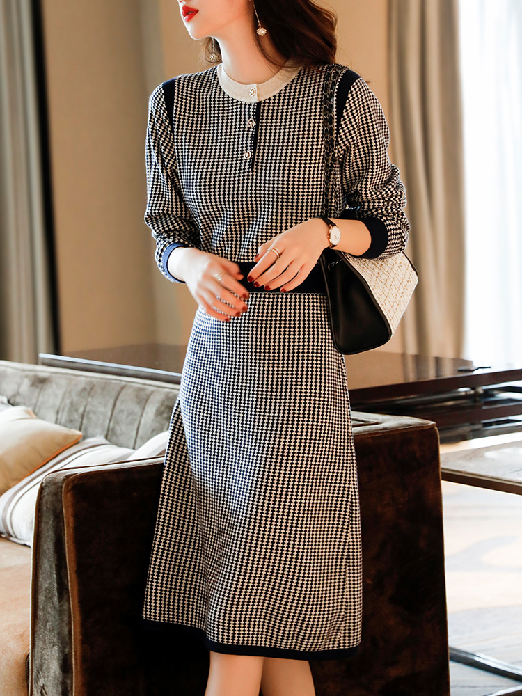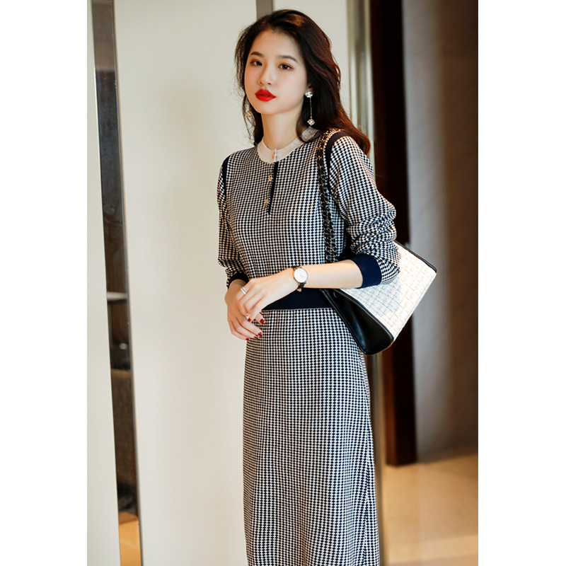 2021秋冬季新款小香风连衣裙毛衣裙气质显瘦黑白格子针织连衣裙女