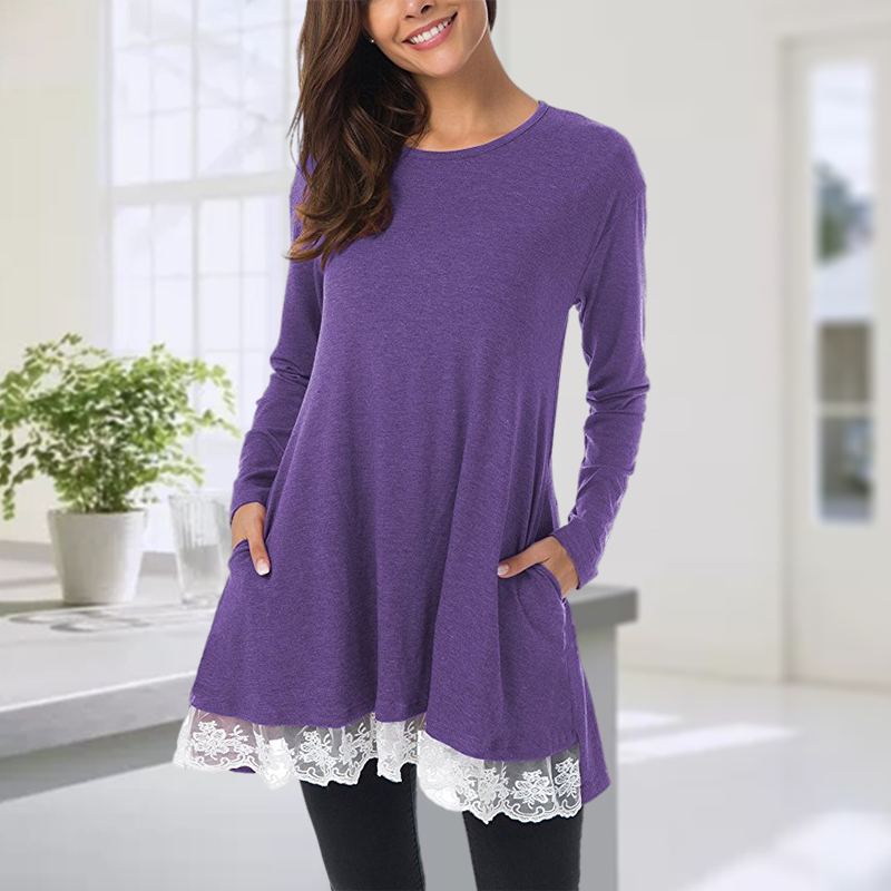 Casual Solid Color Lace Hem Long Sleeve T-shirt