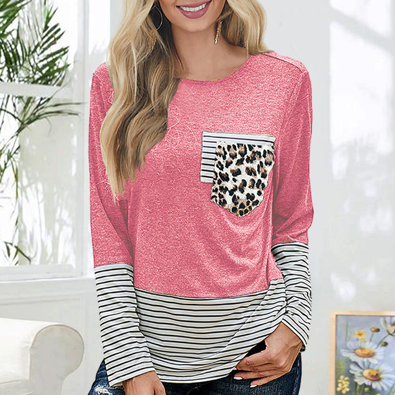 Leopard Striped Splicing Long-Sleeved Casual T-shirt