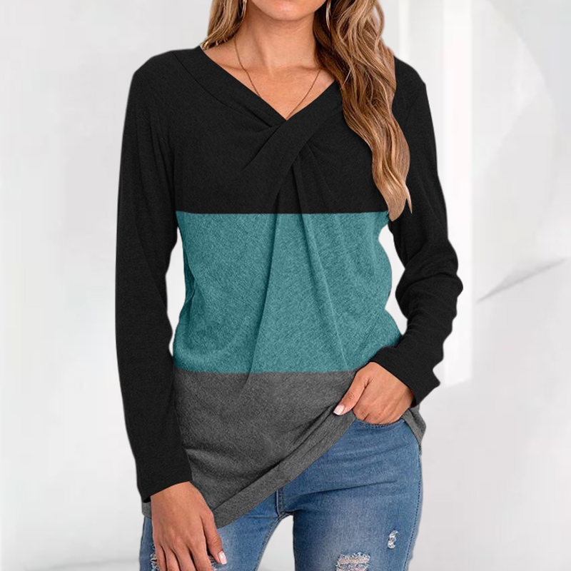 Color Blocking Long-Sleeved Knotted Front T-shirt