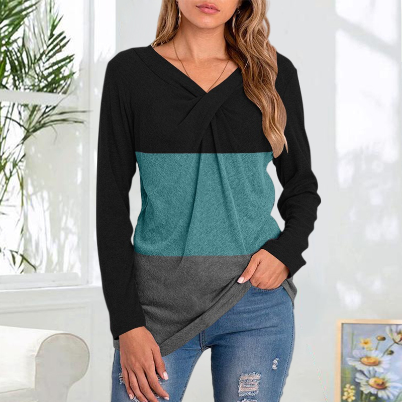 V-neck Color Blocking Knitted Long Sleeve Sweatshirt