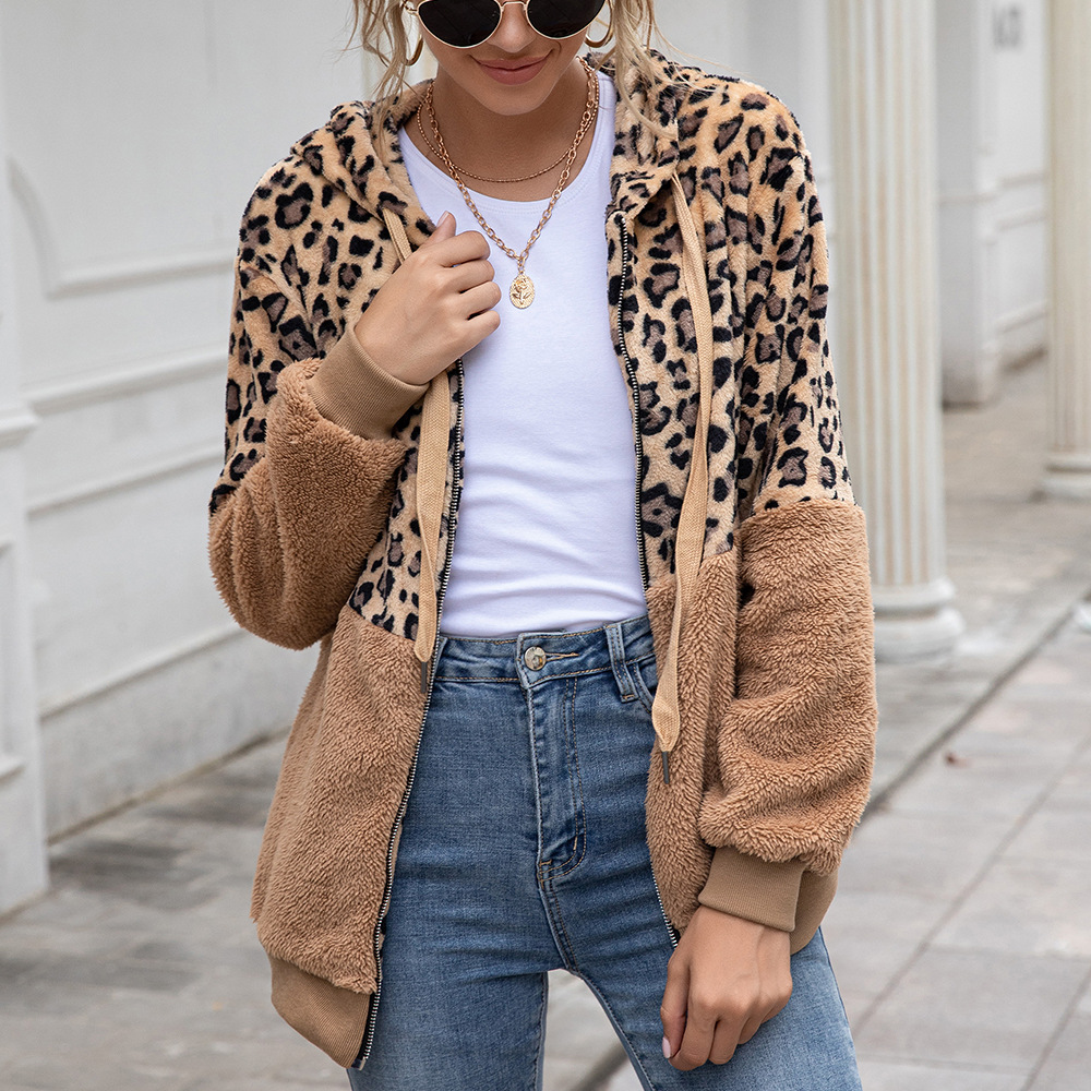Lapel Plush Collar Collision Color Stitching Leopard Print Jacket
