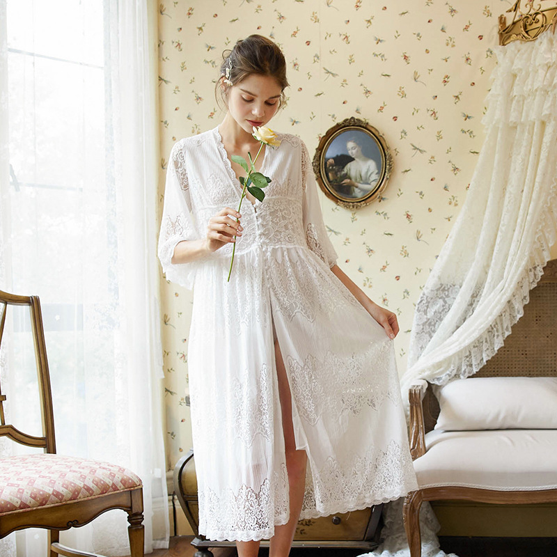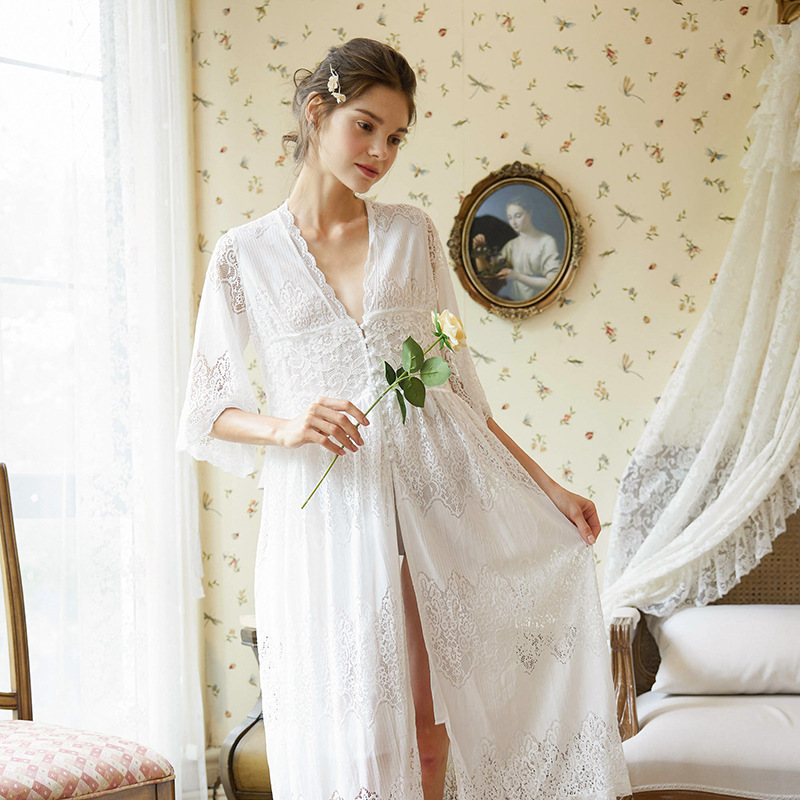 Jacquard Eyelet Lace Long-sleeved Nightgown