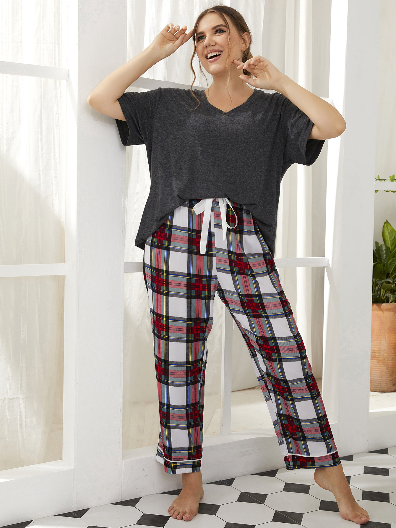 V-neck T-shirt and Checked Print Pants Pyjama Set