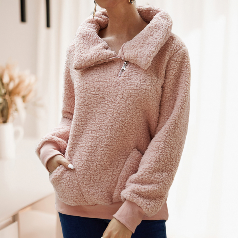 Solid Color Lapel Collar Zipper Fleece Sweatshirt