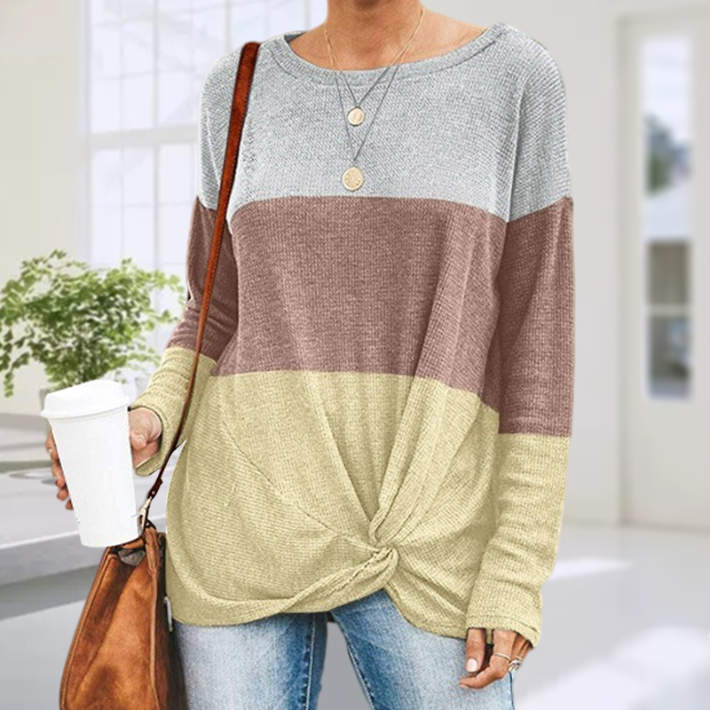 Color Blocking Knotted Front Long-Sleeved T-shirt