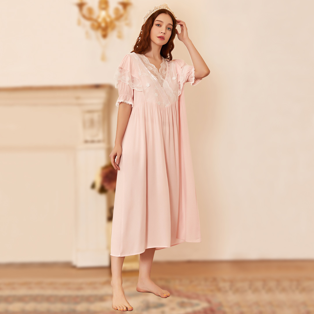 You will feel like you are a princess! This stunning pink maxi dress with very light chiffon fabric featured V-neckline with a lace ruffle border for a vintage look. This long maxi dress has a super feminine silhouette with a floaty hemline. It's so easy to dress up or down with a loose waist.