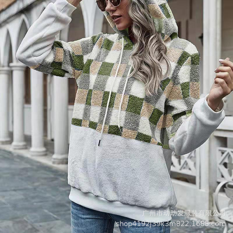 Plaid Color Blocking Hooded Pullover Loose Long-Sleeved Plush Sweater