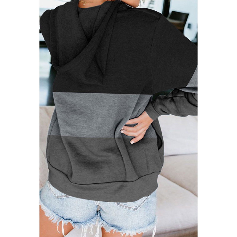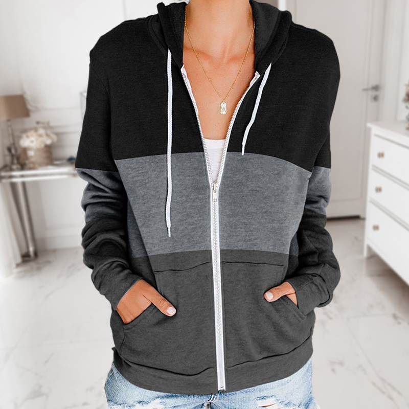Color Blocking Zipper Drawstring Long Sleeve Hooded Sweatshirt