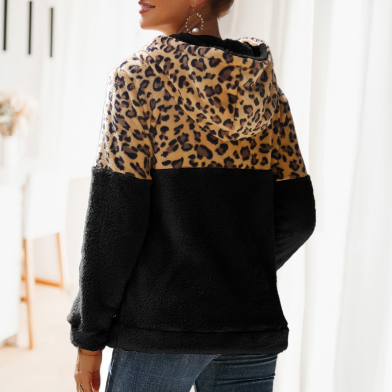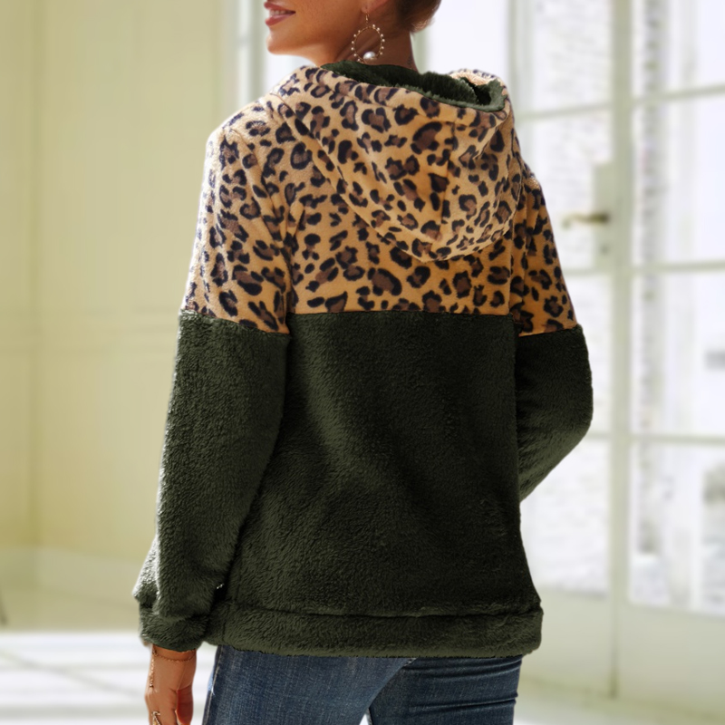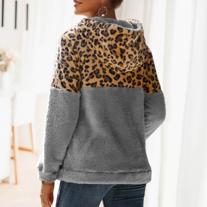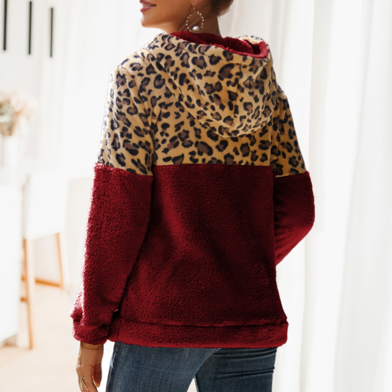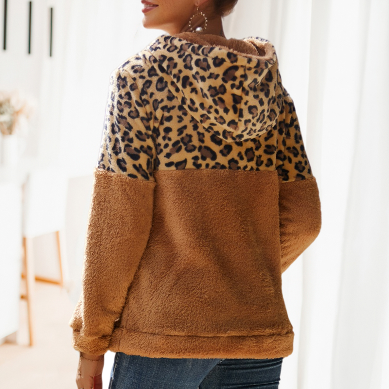 Leopard Print Patchwork Zipper Hooded Fleece Sweatshirt