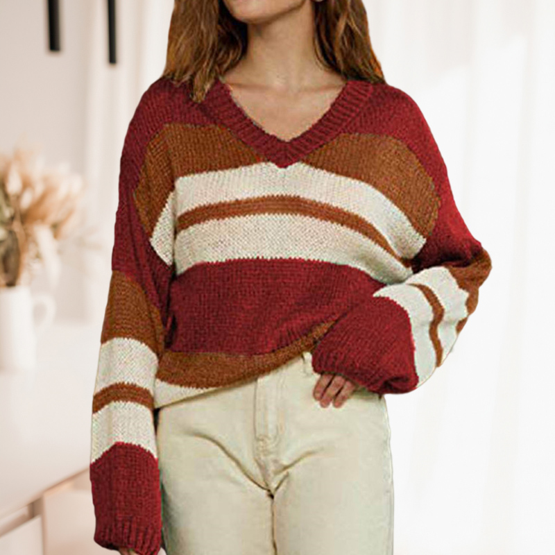 Color Blocking V-neck Loose Long-Sleeved Sweater