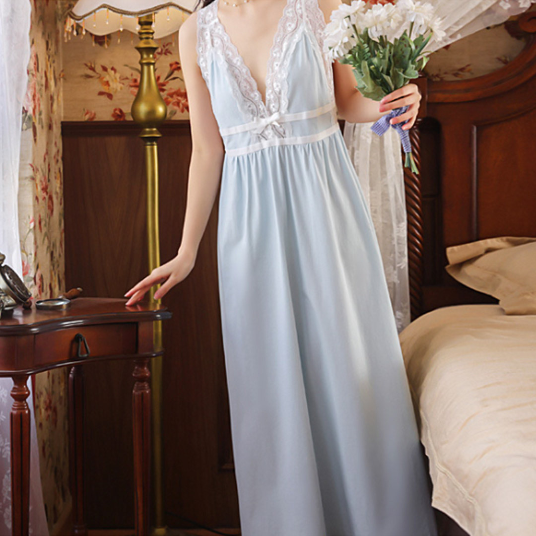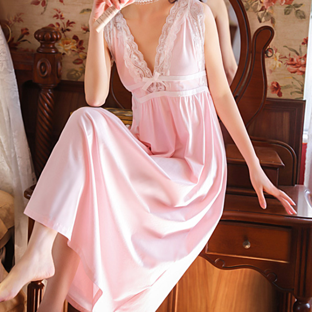 The stunning lace maxi dress features a plunging v neckline detail and body-skimming silhouette that's loose but gives shape. This feminine style nightgown is the ultimate in romance with this floaty full-length hem and soft lace trim. Gorgeous double waistline details add a touch of something special and provide a perfect curve.