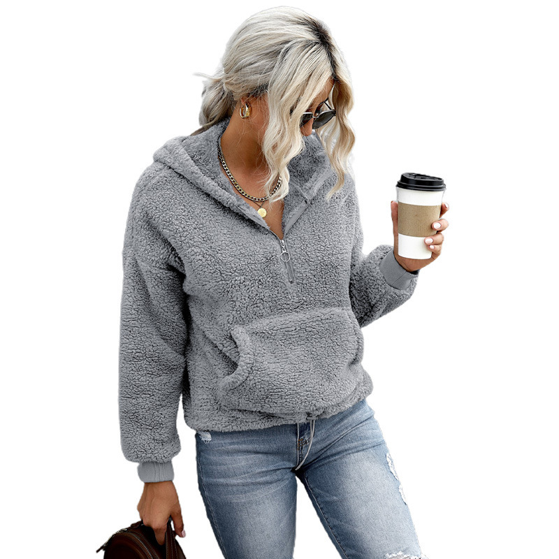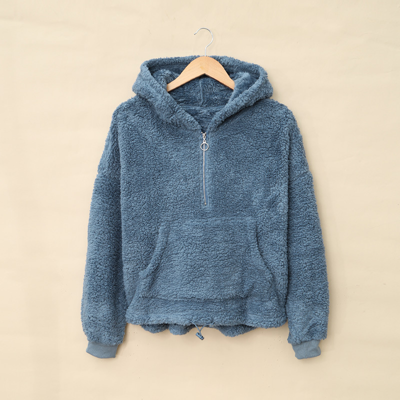 Solid Color Zipper Half Open Collar Pocket Long Sleeve Thickened Plush Sweater