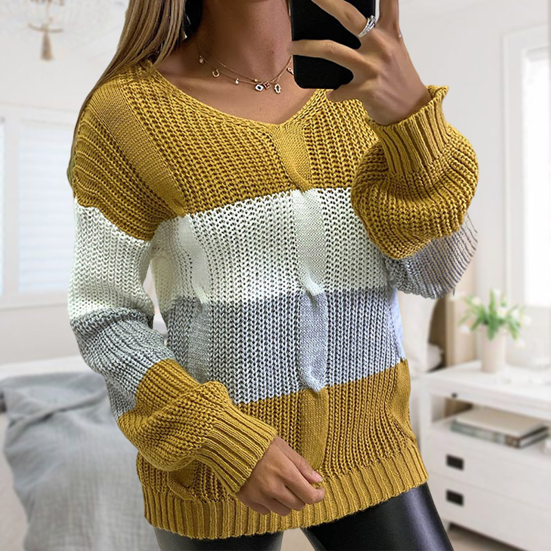 V-neck Color Blocking Twist Knit Long-Sleeved Sweater