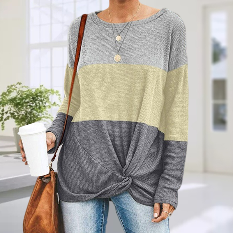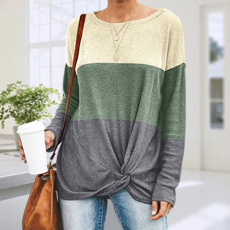 Color Blocking Knotted Front Long-Sleeved T-shirt