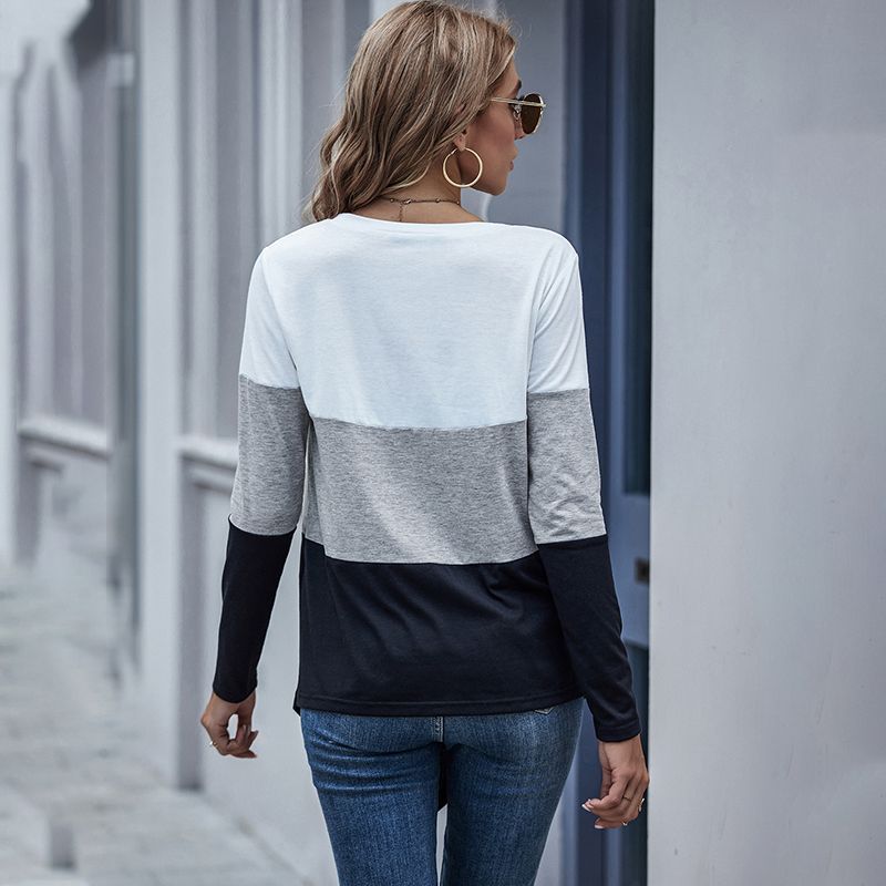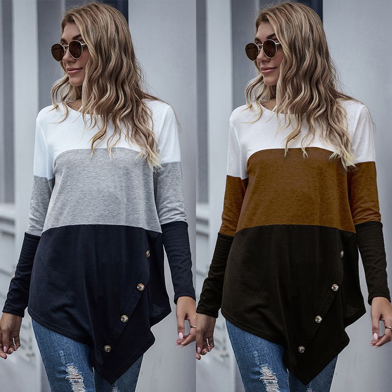 Color Blocking Irregular Button Round Neck Casual Long Sleeve T-Shirt
