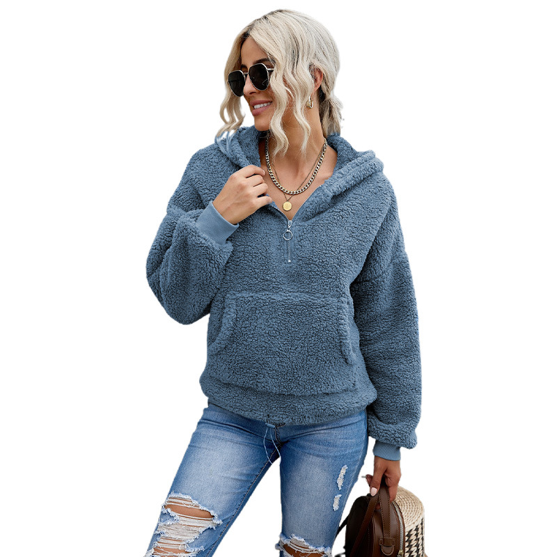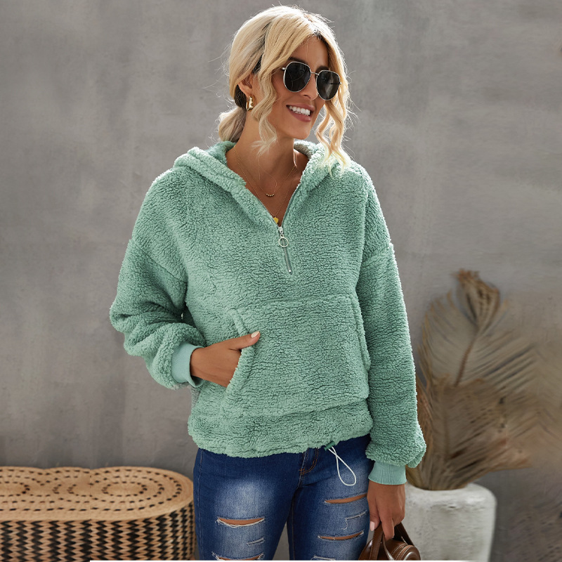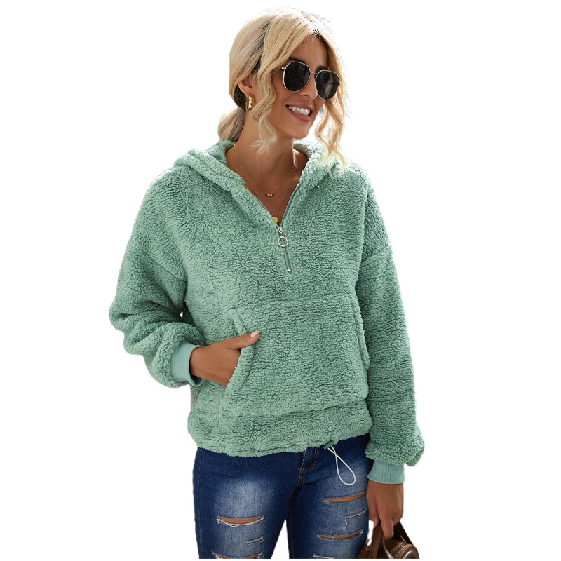 Solid Color Zipper Half Open Collar Pocket Long Sleeve Thickened Plush Sweater