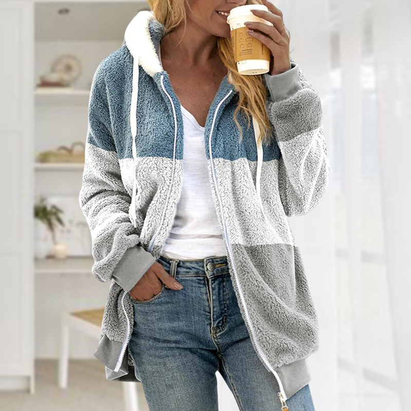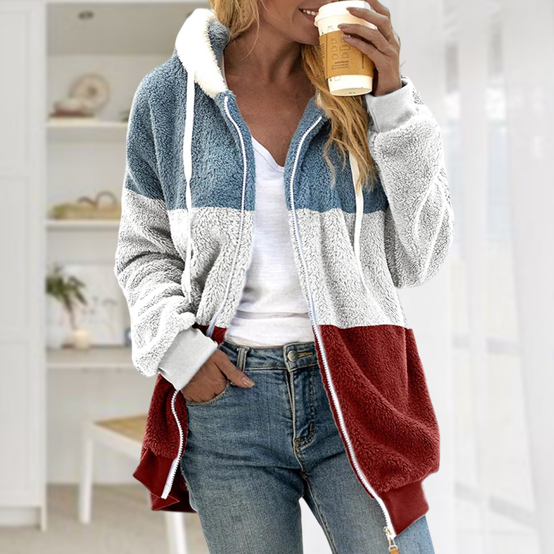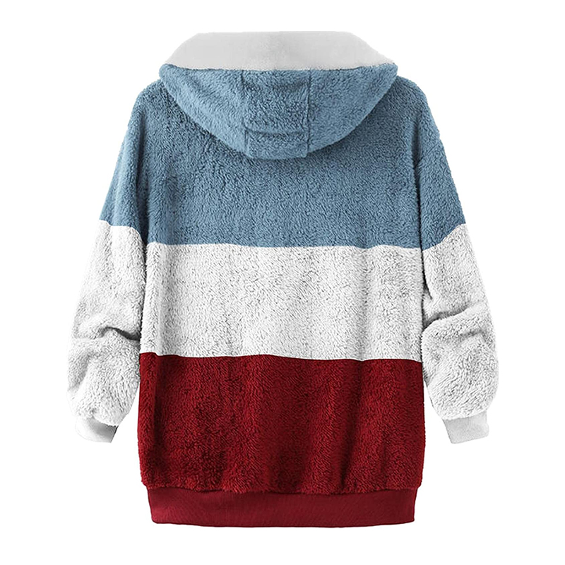 Plus Size Color Block Long Sleeve Hooded Drawstring Fleece Jacket