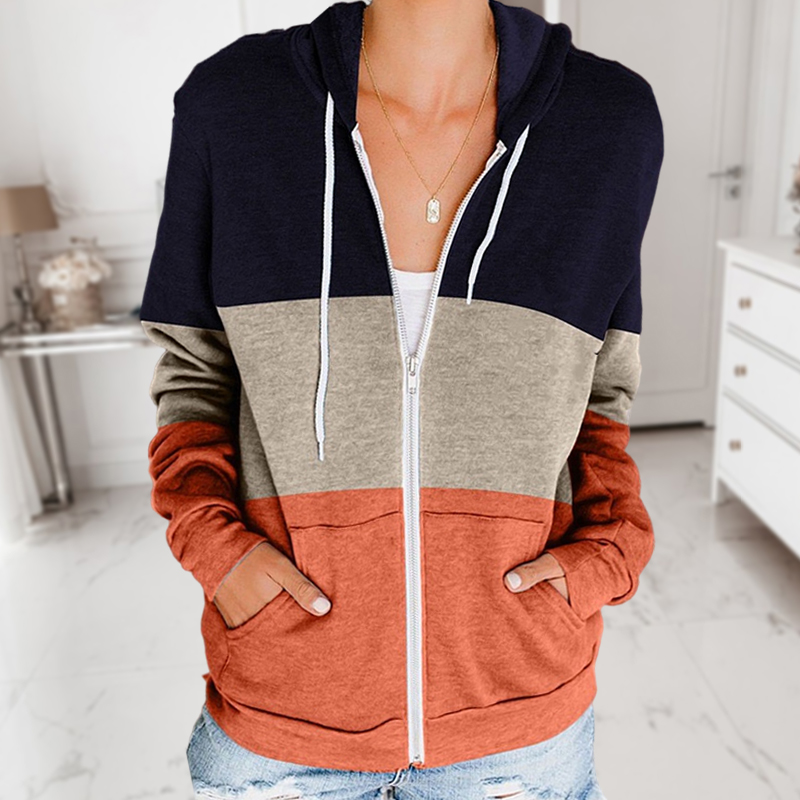 Color Blocking Zipper Drawstring Long Sleeve Hooded Sweatshirt