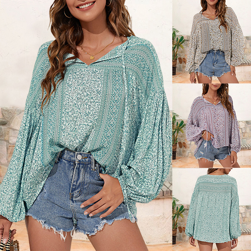 Floral V-Neck Lace-Up Bubble Sleeve Blouse