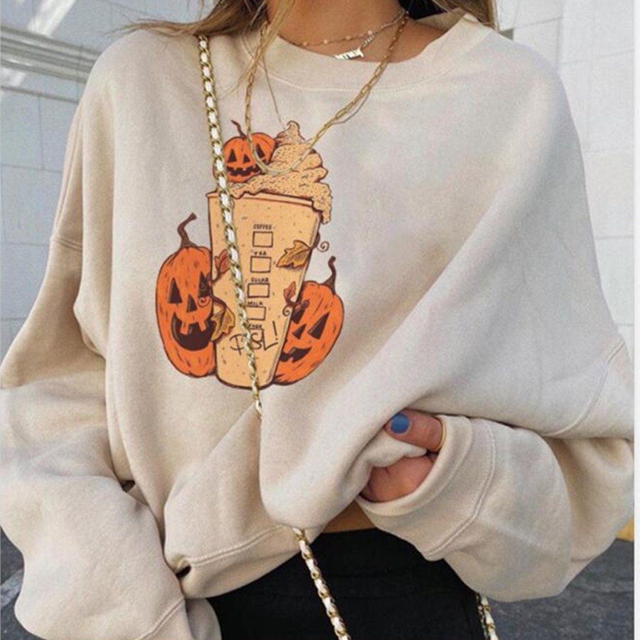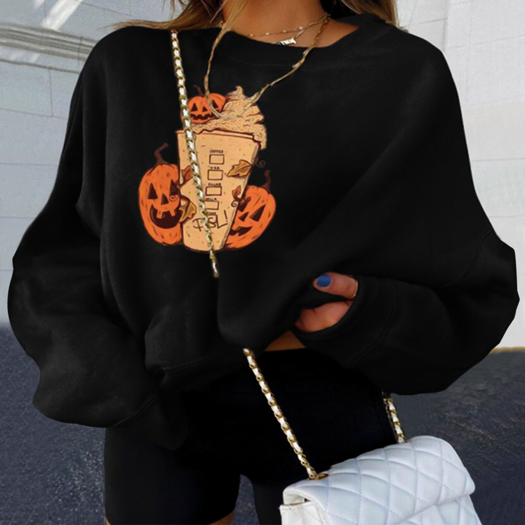 Halloween Pumpkin Print Round Neck Loose Long-Sleeved Padded Sweatshirt