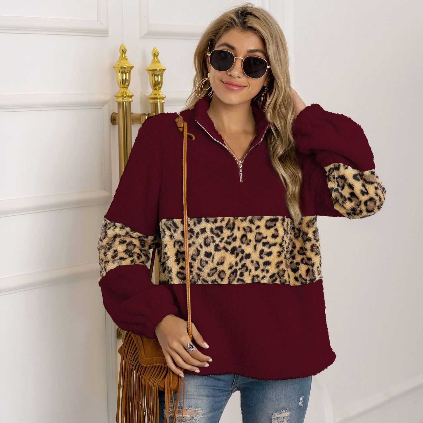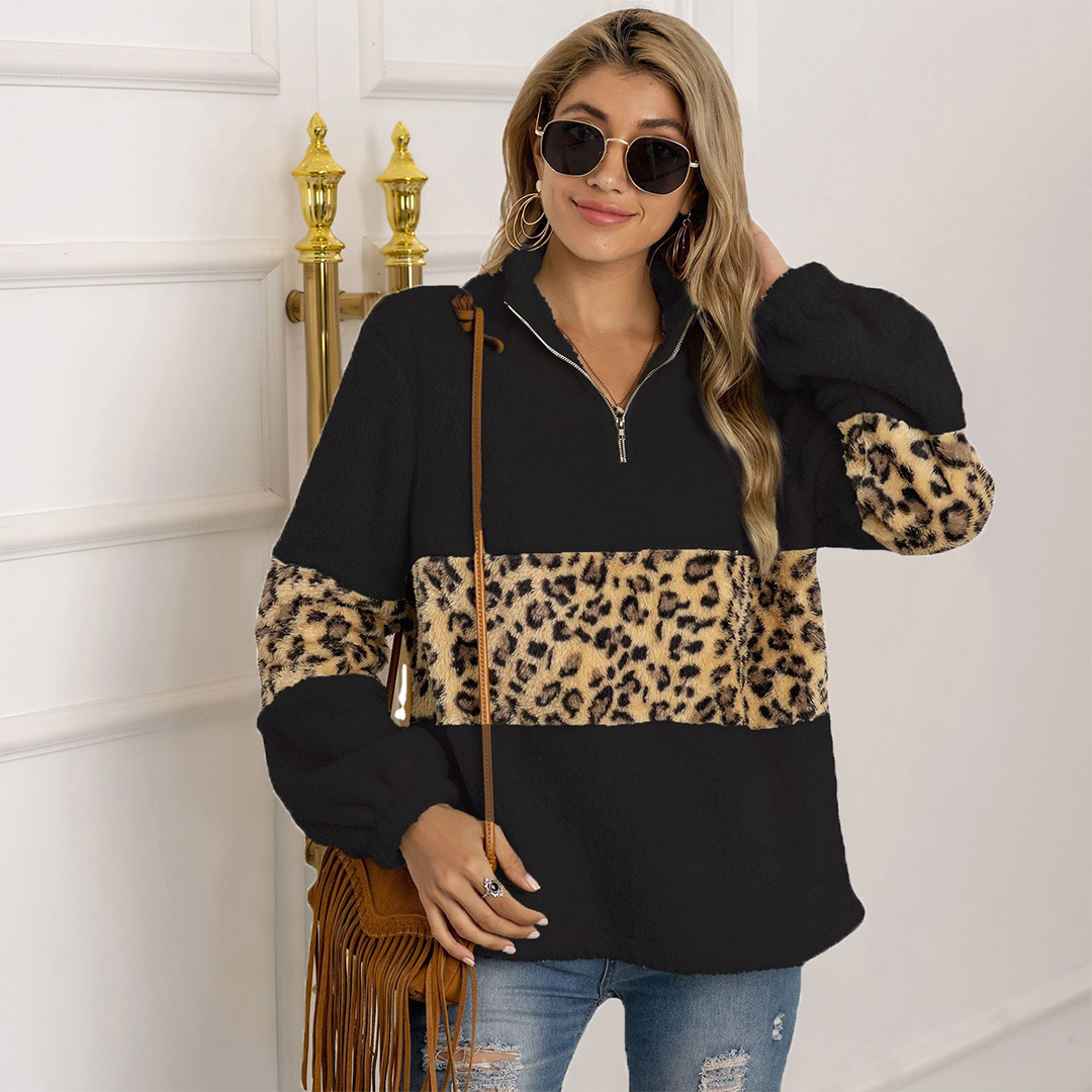 Leopard Print Stand-Up Collar Plush Sweater