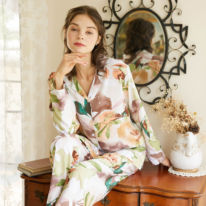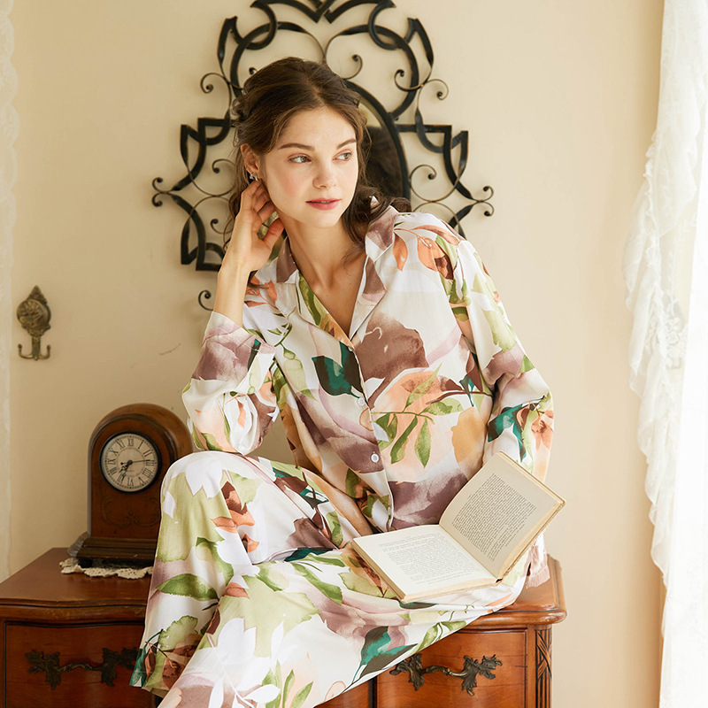 Contemporary and fashion pajamas set, with popular stylish floral pattern. This loose soft pajama set for women, making you more comfortable at night sleep. Perfect fit, long sleeves, notched lapel collar sleepshirt for women, matching with a elastic waistband lounge pants, is a perfect choice for Wedding Night, Honeymoon, Valentine's Day, Anniversary, Bedroom, Bathroom or every hot night, loungewear, or sleepwear.