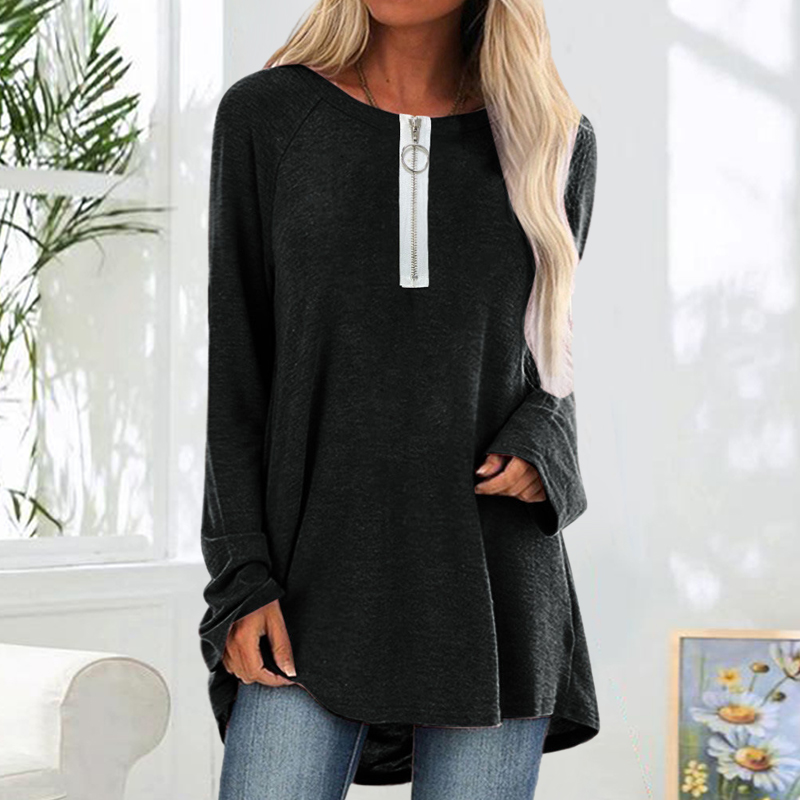 Plus Size Solid Color Casual Zipper Loose Long-Sleeved T-shirt