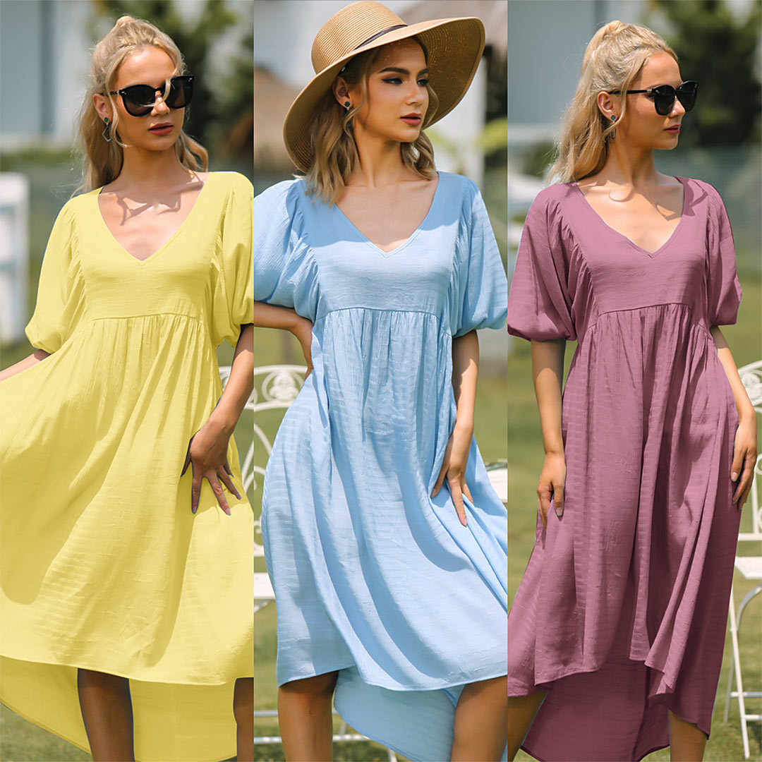 Puffy Sleeve Asymmetric Hem Midi Dress