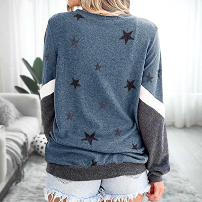 Classic round neckline, casual fall sweatshirts, loose fit pullover sweatshirts. With popular star pattern color blocking details makes the women tops Not boring anymore, make you more fashionable and energetic. With this tendy tops, you will be the one who catch people' s attraction in any occasion.