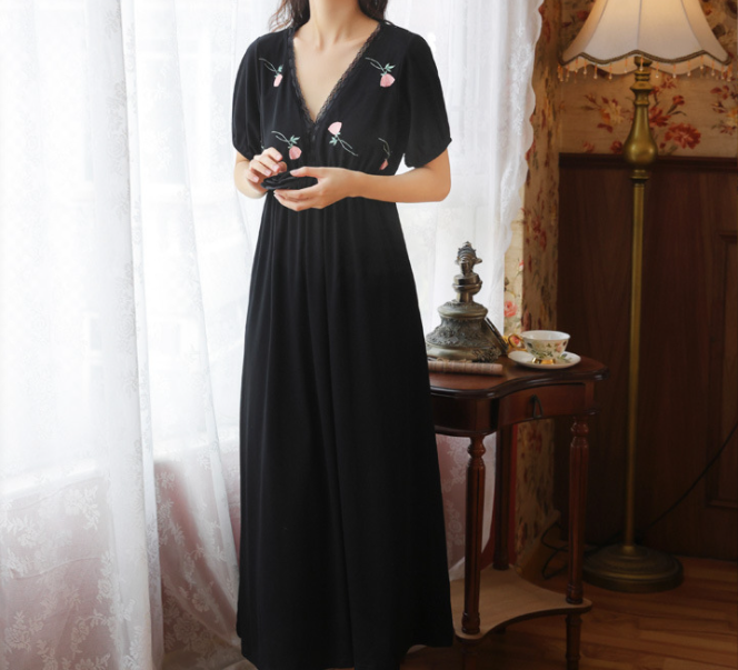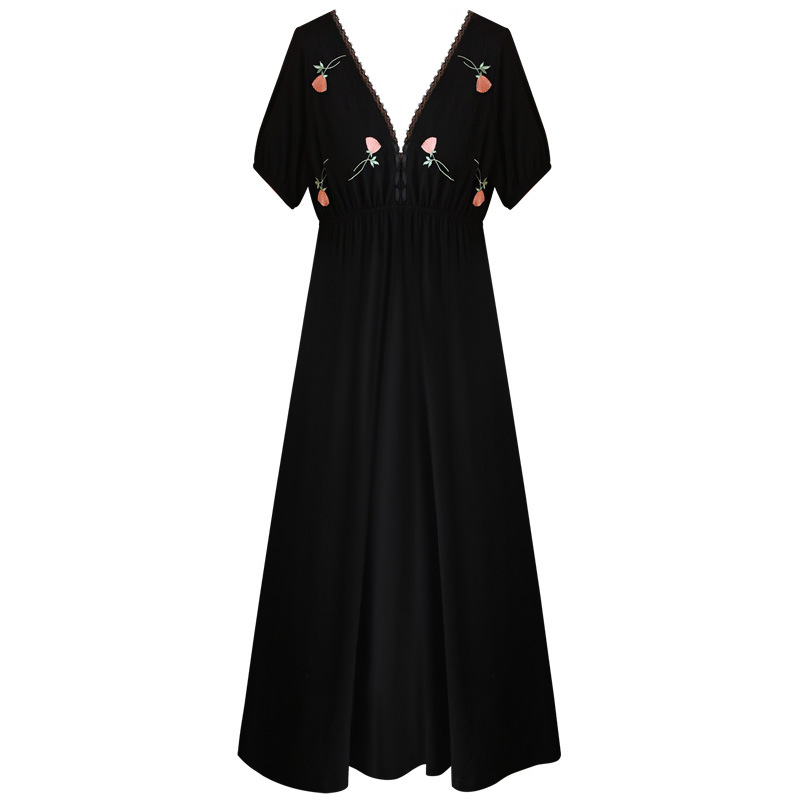 Rose Embroidery Short Sleeve Maxi Dress in Black