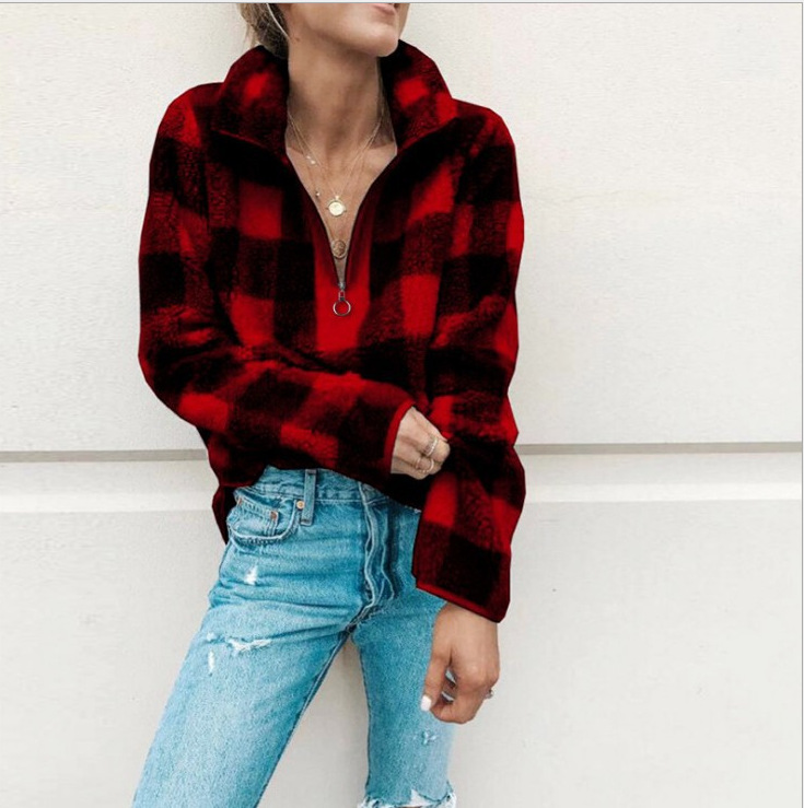 Plaid Long Sleeve High Collar Zipper Fleece Shirt
