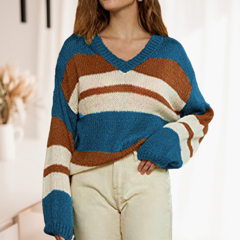 Have a good day in this color block sweater! This knitted sweater features a v-neckline and bishop long sleeves design. And its colorful striped pattern stand out from the background of this sweater, the loose fit style underline the casual feel. Both designs make you eye-catching and attractive.