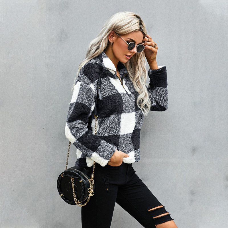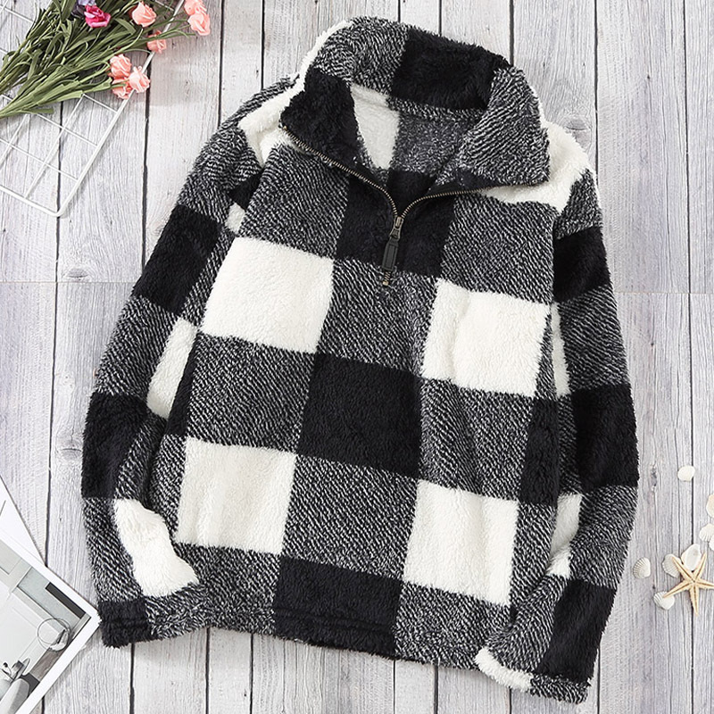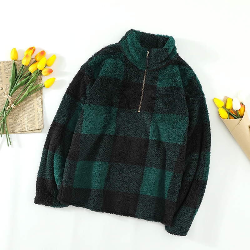 Plaid Print Zipper Half Cardigan Casual Plush Sweater