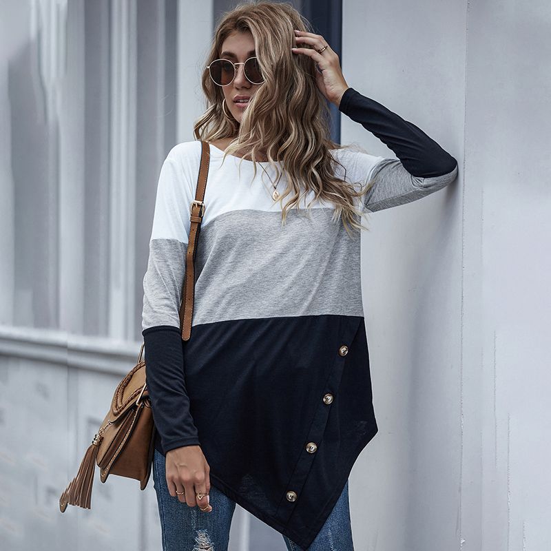 Color Blocking Irregular Button Round Neck Casual Long Sleeve T-Shirt