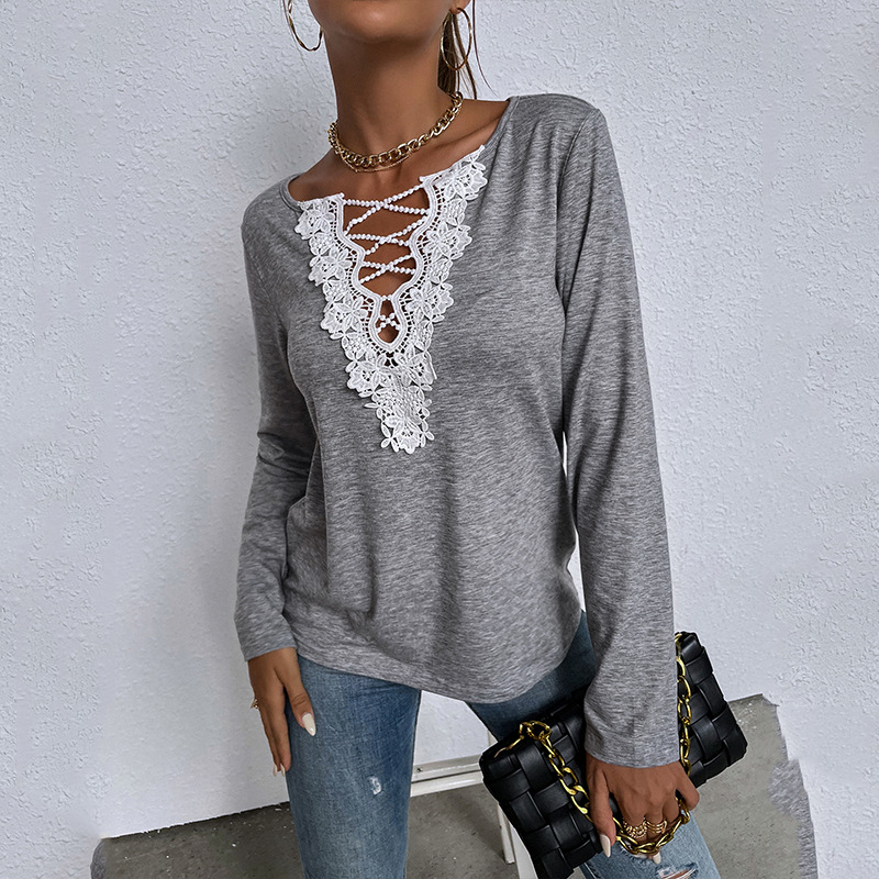 V-neck Solid Color Long-Sleeved Casual T-shirt