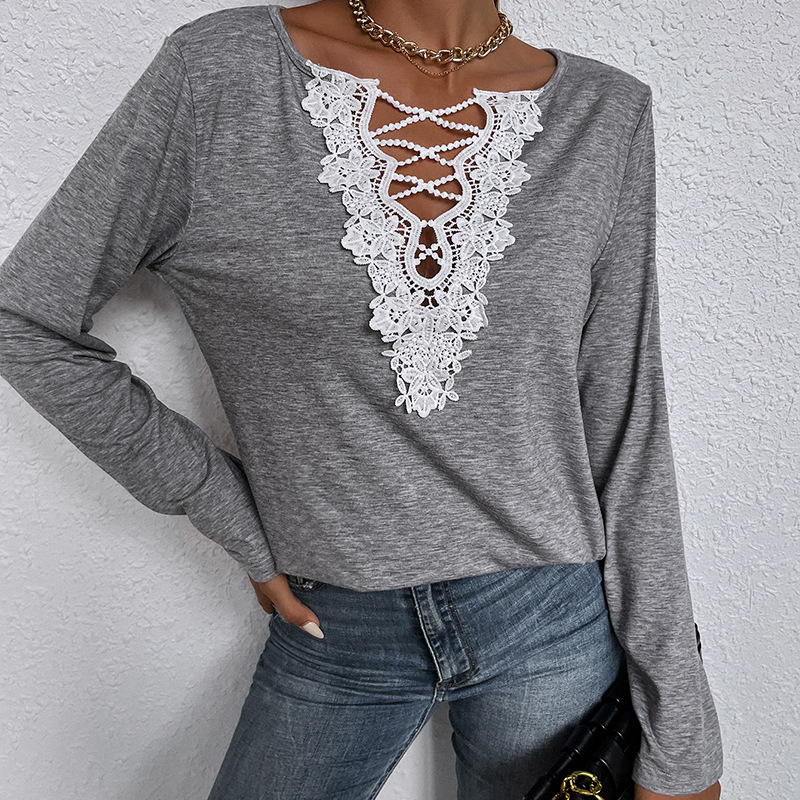 V-Neck Casual Splicing Lantern Sleeve T-Shirt