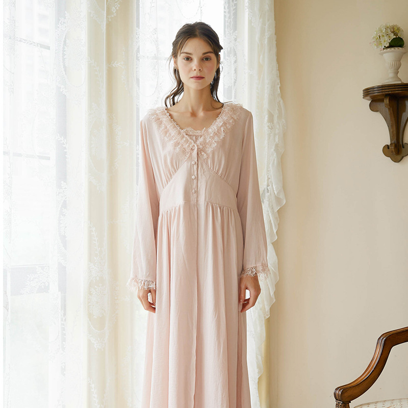 This pink lace-trimmed nightgown is crafted with lightweight cotton fabric, featured with buttons front and v-neck to create a feminine silhouette. It helps you create a charming curve with the elastic back waist and pleated lace border. Perfect for you to wear from your bedroom to the backyard.