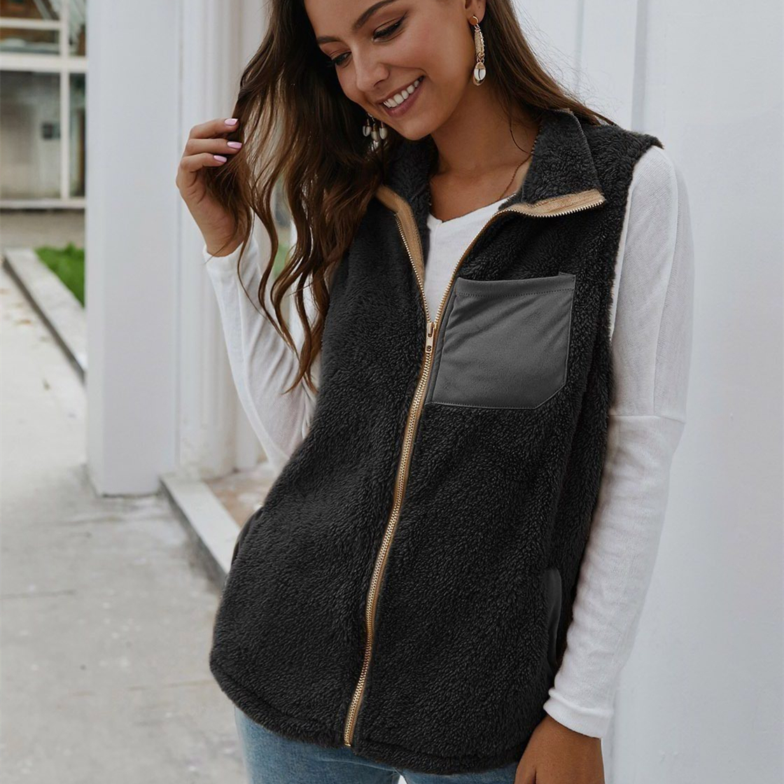 Solid Color Plush Warm Vest Jacket